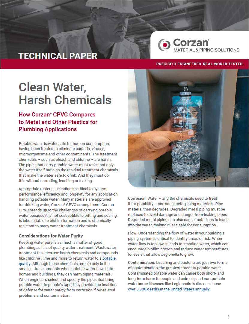 Choosing the right piping material is essential for maintaining water purity and system longevity, especially in environments where water treatment chemicals can compromise infrastructure. This white paper explores Corzan® CPVC, a proven solution for potable water systems because of its ability to innately resist corrosion, biofilm, and chemical degradation.