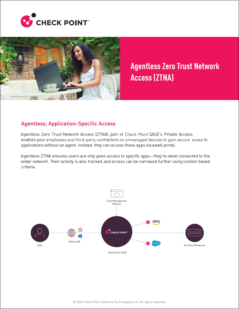 Check Point SASE’s Agentless Zero Trust Network Access (ZTNA) lets employees and contractors access applications securely from any device, without a desktop agent. Instead, they can access these apps via a web portal.
