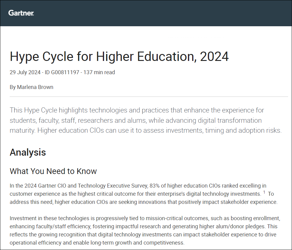 This analysis of the 2024 Hype Cycle for Higher Education highlights a strategic emphasis on technologies that enhance the education journey from enrollment to alumni engagement. With 83% of higher education CIOs prioritizing customer experience, the report examines how investments in AI literacy, open-source GenAI, and Composable ERP systems are setting new benchmarks for operational efficiency and educational impact. Learn how these innovations are not only streamlining administrative tasks but are also revolutionizing student learning, faculty teaching, and institutional growth. Download now to explore the future of higher education technology.