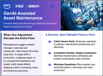 Slalom’s GenAI-Assisted Asset Maintenance provides a smarter way to manage production and maintenance. It enables real-time visibility into shop floor interdependencies, simulating changes, predicting bottlenecks, and optimizing schedules— all while reducing downtime, costs, and disruptions.