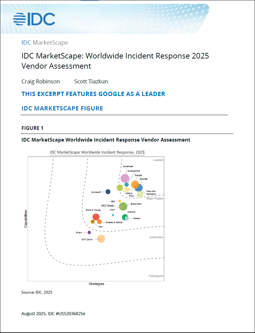 Google is positioned in the Leaders Category in the 2025 IDC MarketScape for worldwide incident response services. We believe this recognition highlights Mandiant’s over two decades of experience responding to some of the world’s most complex and high-impact cyber incidents.