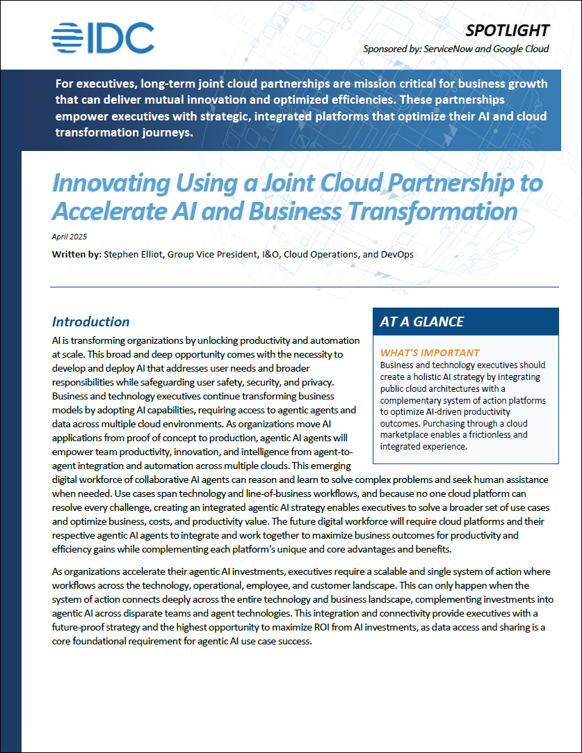 Discover how ServiceNow and Google Cloud unlock strategic, integrated platforms that fuel AI innovation and digital transformation. See how these collaborations drive efficiency, accelerate growth, and help leaders reimagine what’s possible for their business.