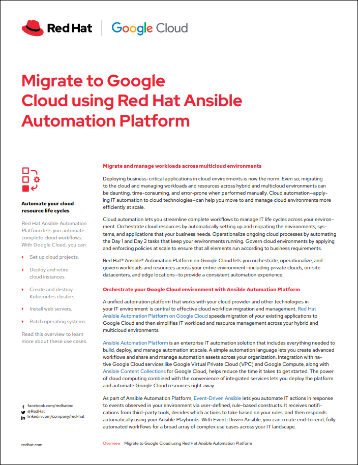 Red Hat Ansible Automation Platform on Google Cloud lets you orchestrate, operationalize, and govern workloads and resources across hybrid and multicloud environments.