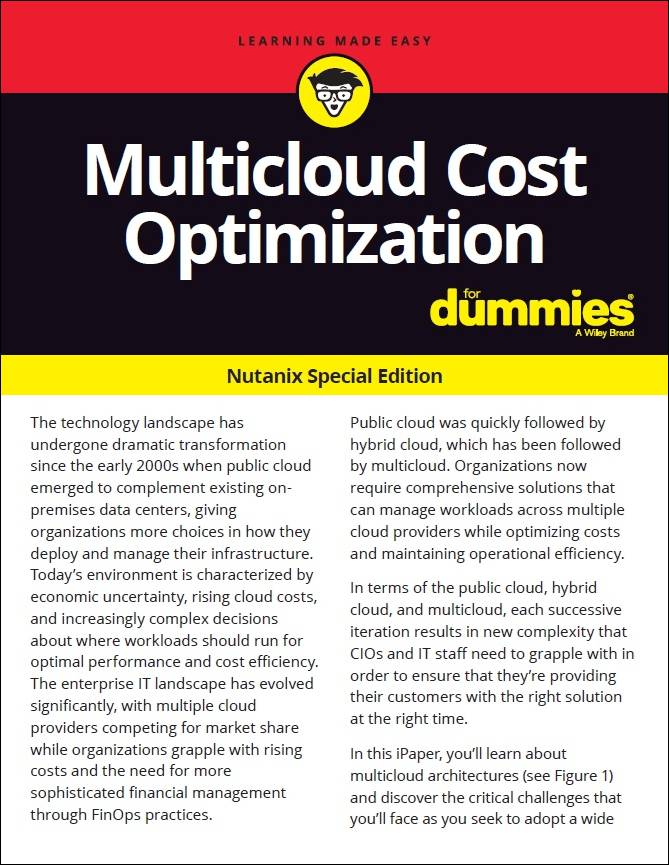 The Multi-cloud Cost Optimization for Dummies ebook covers the basics of multi-cloud infrastructure while explaining considerations that organizations need to make when deciding between public, hybrid and multi-cloud environments. This ebook will help you understand how to optimize the cost of running your own multi-cloud infrastructure, including insights into: