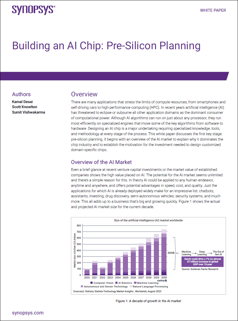 This white paper explores the critical first stage of AI chip development: pre-silicon planning. As artificial intelligence emerges as the dominant consumer of computational power, the demand for specialized AI chips has surged. The paper provides an overview of the AI market, highlighting the rapid growth and potential of AI applications across various sectors. It discusses the challenges of designing AI chips, including increased costs and power demands due to complex workloads. The importance of architecture exploration and IP selection during the pre-silicon phase is emphasized, showcasing how Synopsys’ tools can streamline the design process and optimize performance and power efficiency.