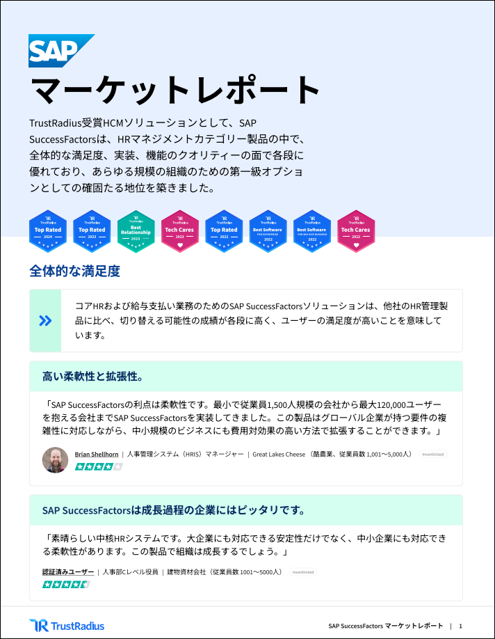 TrustRadiusマーケットレポートをダウンロードして、SAP SuccessFactors HCMの他社製品との比較結果、さらに世界中の先進的なHRチームがSAP SuccessFactors HCMを選ぶ理由をご確認ください。