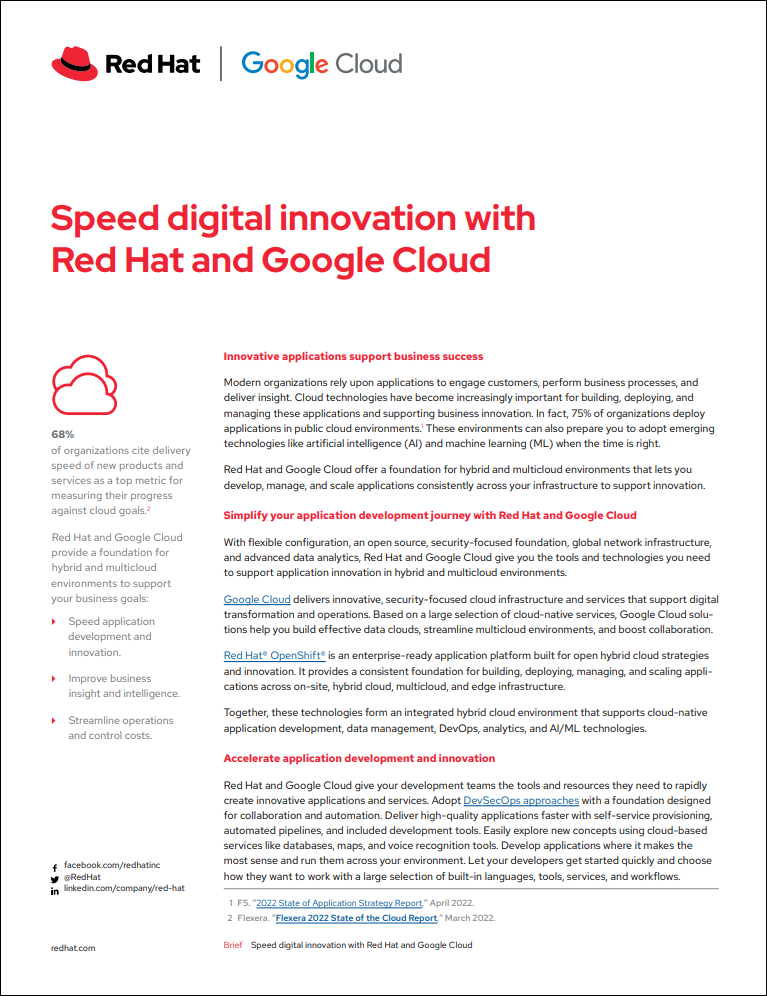 cloudeBook Speed digital innovation with Red Hat and Google Cloud Speed digital innovation with Red Hat and Google Cloud Red Hat and Google Cloud provide a foundation for hybrid and multicloud environments to support your business goals.