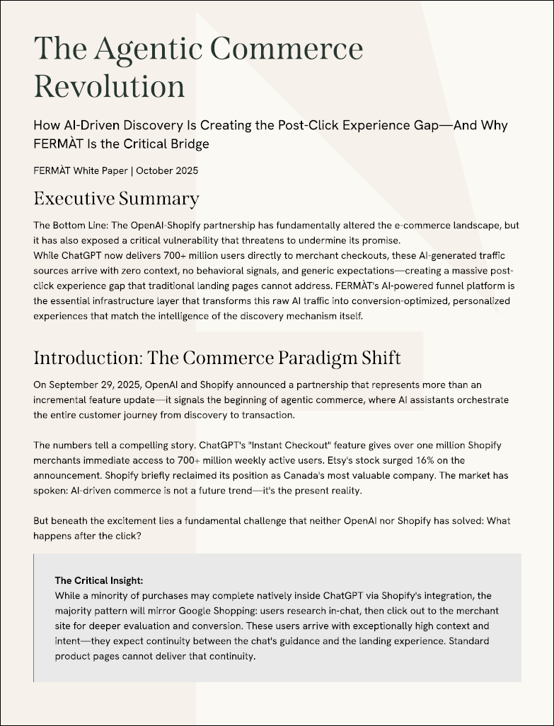 The Bottom Line: The OpenAI-Shopify partnership has fundamentally altered the e-commerce landscape, but it has also exposed a critical vulnerability that threatens to undermine its promise. While ChatGPT now delivers 700+ million users directly to merchant checkouts, these AI-generated traffic sources arrive with zero context, no behavioral signals, and generic expectations—creating a massive post-click experience gap that traditional landing pages cannot address. FERMÀT’s AI-powered funnel platform is the essential infrastructure layer that transforms this raw AI traffic into conversion-optimized, personalized experiences that match the intelligence of the discovery mechanism itself.