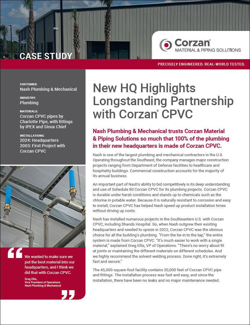 When Nash Plumbing & Mechanical outgrew their headquarters, they made the smart decision for their new facility’s plumbing system—one that reflects decades of trust and proven performance. This case study explores how Corzan® CPVC became their go-to solution and the role it plays in their competitive edge.